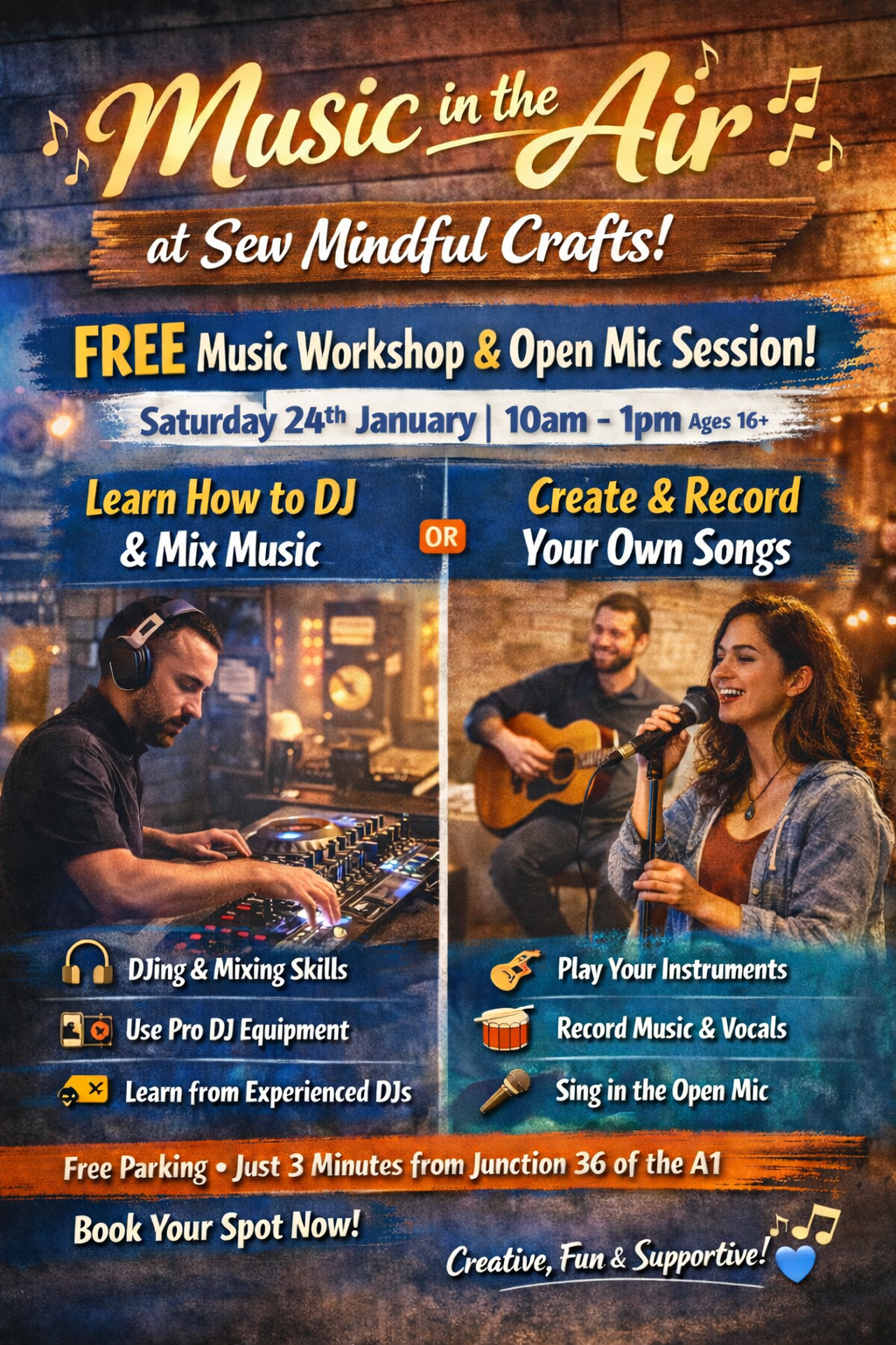 Welcome to Music Production, DJ Skills & Open Mic, a creative and inclusive workshop for people aged 16 and over who want to explore music, build confidence, and express themselves in a relaxed, supportive environment.
